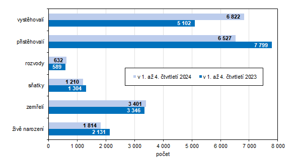 Počet obyvatel našeho kraje v 1. až 4. čtvrtletí 2024 doznal od začátku roku úbytek o 1 882 osob. Za tímto úbytkem obyvatelstva stojí záporné přirozené i migrační saldo. Ve sledovaném roce zde zemřelo 3 401 osob, což je o 1 587 více, než kolik se narodilo dětí. Současně se do kraje ve sledovaném roce přistěhovalo o 295 osob méně, než kolik se jich vystěhovalo.