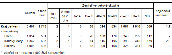 V Karlovarském kraji v 1. až 4. čtvrtletí 2024 zemřelo 3 401 osob, z toho 1 743 mužů. V porovnání se stejným obdobím minulého roku došlo k mírnému nárůstu počtu zemřelých o 55 osob, tj. o 1,6 %. Karlovarský kraj tak byl jedním ze čtyř regionů ČR, kde se počet zemřelých v porovnání s minulým rokem zvýšil. Tento nárůst byl druhý nejvyšší po Plzeňském kraji.