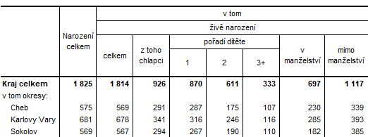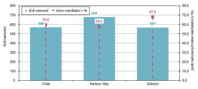 Ze všech živě narozených dětí v našem kraji se jich 1 117, tj. 61,6 % narodilo mimo manželství. Jedná se o druhý nejvyšší podíl v rámci celé ČR, vyšší podíl těchto dětí vykazuje pouze Ústecký kraj (62,9 %). Mezi okresy Karlovarského kraje vykazuje nejvyšší podíl dětí narozených mimo manželství okres Sokolov (67,9 % všech živě narozených dětí), naopak nejnižší podíl dětí narozených mimo manželství udává okres Karlovy Vary (58,0 %).