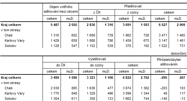 V 1. až 4. čtvrtletí 2024 se na území ČR přistěhovalo 121 823 osob a 84 978 se vystěhovalo. Do našeho kraje se přistěhovalo 6 527 obyvatel, z toho bylo 44,6 % mužů. Z celkového počtu přistěhovalých se 56,5 % přistěhovalo z ciziny a zbývajících 43,5 % z jiných regionů ČR. Z Karlovarského kraje se v uvedeném období vystěhovalo 6 822 obyvatel. Do ciziny se odstěhovalo 48,7 % všech vystěhovalých a do jiných krajů ČR 51,3 %.