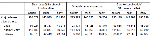 Počet obyvatel se v Karlovarském kraji v 1. až 4. čtvrtletí 2024 snížil, a to důsledkem jak přirozeného úbytku obyvatelstva, tak i vlivem záporného migračního salda. Počet živě narozených dětí dosáhl svého historického minima. Na konci roku 2024 žilo v Karlovarském kraji podle předběžných výsledků 293 195 obyvatel.