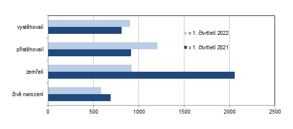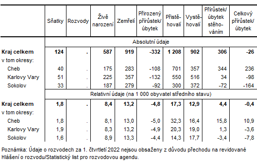 Pohyb obyvatelstva v Karlovarském kraji a jeho okresech v 1. čtvrtletí 2022