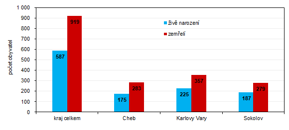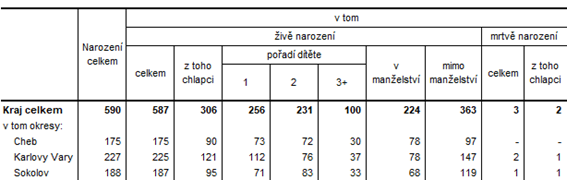 Od 1. ledna do 31. března 2022 se na území Karlovarského kraje živě narodilo 587 dětí, počet živě narozených dětí se tak meziročně snížil o 104 dětí, tj. o 15,1 %. Ze všech živě narozených dětí v Karlovarském kraji jich 43,6 % přišlo na svět jako první v pořadí a na 100, tj. na 17,0 % již doma čekali více než dva sourozenci.