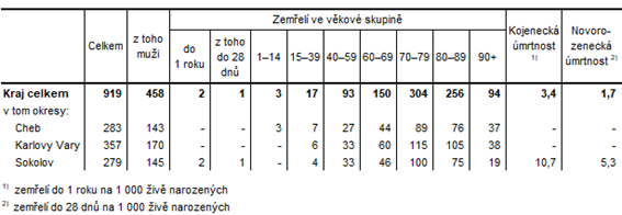 V 1. čtvrtletí 2022 zemřelo v České republice 31 864 osob, což bylo o 14 956, tj. o 31,9 % méně než ve stejném období loňského roku. V Karlovarském kraji dosáhl v období od 1. 1 do 31. 3. 2022 počet zemřelých 919 osob. Ve srovnání s 1. čtvrtletím minulého roku, tak došlo k výraznému snížení počtu zemřelých (o 1 135 osob, tj. o 55,3 %). Nižší počet zemřelých vykazovaly meziročně všechny regiony ČR bez výjimky. V našem kraji byl přitom tento pokles nejvýraznější, což je dáno velmi vysokou úmrtností na počátku minulého roku. Mezi zemřelými bylo v našem kraji nejvíce těch ve věkových kategoriích 70 až 79 let (31,9 % všech zemřelých v kraji) a 80 až 89 let (27,9 % všech zemřelých v kraji). Kojenecká úmrtnost (tzn. zemřelí do 1 roku na 1 000 živě narozených) v Karlovarském kraji dosahovala hodnoty 3,4 ‰, což je pátá nejvyšší hodnota v celé ČR a o 1 procentní bod převyšuje průměr ČR.