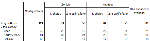 V 1. čtvrtletí 2022 uzavřeli muži a ženy Karlovarského kraje 124 sňatků, náš kraj tak zaznamenal meziroční nárůst počtu sňatků ve srovnání se stejným obdobím roku 2021, a to o 23, tj. o 22,8 %. Stejně jako v předchozích letech snoubence přitahovala číselně atraktivní data sňatku, letos jednoznačně nejvíce lákalo magické datum 22. 02. 2022. Tento den bylo oddáno v našem kraji 26 párů snoubenců, což je zhruba pětina všech dvojic, které vstoupily do manželství v celém 1. čtvrtletí tohoto roku.
