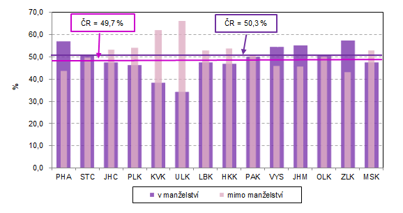 Ze všech živě narozených dětí v našem kraji se jich 363, tj. 61,8 % narodilo mimo manželství. Jedná se o druhý nejvyšší podíl v rámci celé České republiky, vyšší podíl těchto dětí vykazuje pouze Ústecký kraj (65,8 %). Mezi okresy Karlovarského kraje vykazuje nejvyšší podíl dětí narozených mimo manželství okres Karlovy Vary (65,3 % všech živě narozených dětí), naopak nejnižší podíl dětí narozených mimo manželství udává okres Cheb (55,4 %).