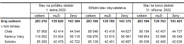 Počet obyvatel v Karlovarském kraji a jeho okresech v 1. čtvrtletí 2022 (předběžné údaje)