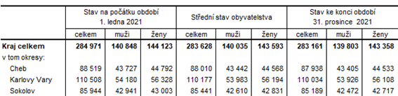 Počet obyvatel se v Karlovarském kraji v roce 2021 opět snížil, a to důsledkem přirozeného úbytku obyvatelstva. Na konci prosince 2021 žilo v Karlovarském kraji podle předběžných výsledků 283 161 obyvatel, z nichž 50,6 % byly ženy. Ve všech okresech kraje více obyvatel zemřelo, než kolik se jich narodilo.