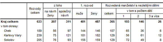 Ve sledovaném období bylo rozvedeno celkem 633 manželských párů, náš kraj tak zaznamenal meziroční pokles počtu rozvodů ve srovnání se stejným obdobím roku 2020, a to o 39, tj. o 5,8 %. Společný návrh na rozvod podalo 311 manželů (49,1 % všech rozvodů). Téměř v 60 % těchto rozvádějících se manželství žilo jedno či více nezletilých dětí.