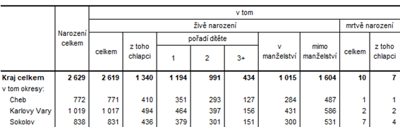 Od 1. ledna do 31. prosince 2021 se na území Karlovarského kraje živě narodilo 2 619 dětí, počet živě narozených dětí se tak meziročně snížil o 63 dětí, tj. o 2,3 %. Ze všech živě narozených dětí v Karlovarském kraji jich 45,6 % přišlo na svět jako první v pořadí a na 434, tj. na 16,6 % již doma čekali nejméně dva sourozenci.