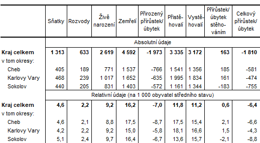Počet obyvatel kraje doznal od začátku roku úbytek o 1 810 osob. Tento úbytek byl způsoben vlivem záporného přirozeného přírůstku, kdy zemřelo o 1 973 osob více, než kolik se jich narodilo. Naopak migrační saldo vykázalo kladou hodnotu, do kraje se přistěhovalo o 163 osob více než kolik se jich vystěhovalo. Úbytek obyvatel zaznamenalo šest regionů ČR, v našem kraji byl tento úbytek největší (o 0,6 %).