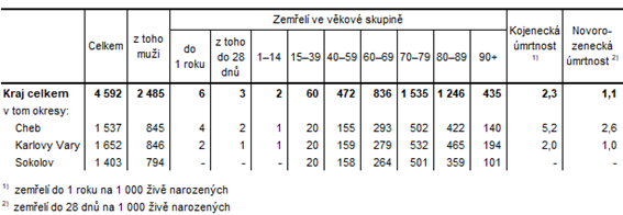 Mezi zemřelými bylo v našem kraji nejvíce těch ve věkových kategoriích 70 až 79 let (33,4 % všech zemřelých v kraji) a 80 až 89 let (27,1 % všech zemřelých v kraji). Kojenecká úmrtnost (tzn. zemřelí do 1 roku na 1 000 živě narozených) činila 2,3 ‰.