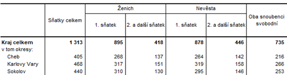 V roce 2021 uzavřeli muži a ženy Karlovarského kraje 1 313 sňatků, což je o 81 sňatků, tj. 6,6 % více než v roce 2020. Pro většinu ženichů i nevěst se jednalo o první sňatek (68,2 %, resp. 66,9 %). Z celkového počtu uzavřených manželství bylo 56,0 % takových, kde oba snoubenci byli svobodní.