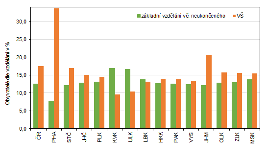 Obyvatelstvo ve věku 15 a více let se základním vzděláním a s VŠ vzděláním v jednotlivých krajích
