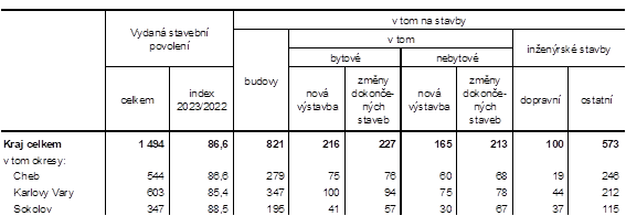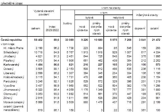 Stavební úřady v Karlovarském kraji vydaly v 1. až 3. čtvrtletí 2023 celkem 1 494 stavebních povolení, což je o 13,4 % méně než v předchozím roce. Na republikovém celku vydaných staveních povolení se náš kraj podílel 2,6 %. Nejvíce stavebních povolení připadalo na inženýrské stavby (45,0 %) a na bytové budovy (29,7 %).