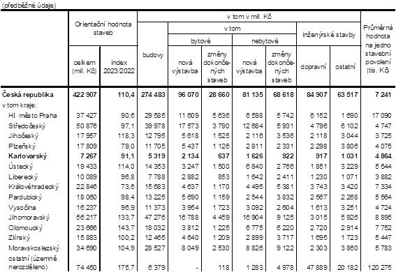 Z celkové orientační hodnoty staveb, na které byla vydána stavební povolení v Karlovarském kraji (7,3 mld. Kč), připadal největší podíl na bytovou výstavbu (38,1 %), více než třetina orientační hodnoty staveb souvisela s výstavbou nebytových budov (35,1 %) a více než čtvrtina (26,8 %) byla proinvestována na inženýrské stavby.