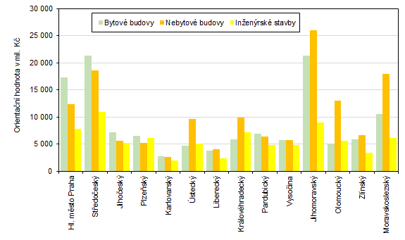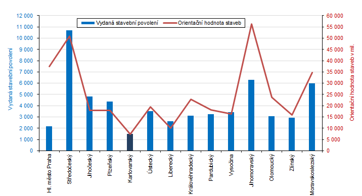 Orientační hodnota staveb, na které byla ve sledovaném období vydána stavební povolení, dosáhla v České republice hodnoty 422,9 mld. Kč a v porovnání se stejným obdobím předchozího roku tak zaznamenala nárůst o 10,4 %. Nejvyšší absolutní přírůstek vykázal Jihomoravský kraj (o 14,2 mil. Kč), nejvyšší relativní pak Olomoucký kraj (o 43,7 %). Osm krajů České republiky zaznamenalo pokles orientační hodnoty – nejvýraznější absolutní i relativní propad byl zjištěn v Královéhradeckém kraji (o 8,2 mil. Kč, tj. o 26,4 %).