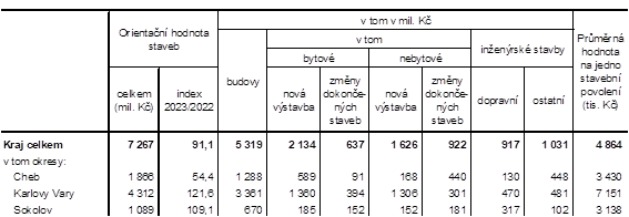 V 1. až 3. čtvrtletí 2023 vydaly stavební úřady v Karlovarském kraji celkem 1 494 stavebních povolení, což je o 13,4 % méně než ve stejném období minulého roku. Orientační hodnota povolených staveb v našem kraji dosáhla 7,3 mld. Kč, ve srovnání se shodným obdobím předchozího roku tak došlo k poklesu této hodnoty o 8,9 %. Průměrná hodnota na jedno stavební povolení dosáhla výše 4 864 tis. Kč.