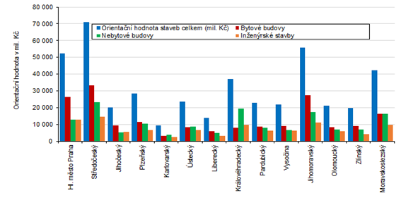 Orientační hodnota staveb, na které byla ve sledovaném období vydána stavební povolení, dosáhla v České republice hodnoty 512,8 mld. Kč a v porovnání se stejným obdobím předchozího roku tak zaznamenala nepatrný pokles (o 1,6 %). Ve většině regionů ČR vykázala orientační hodnota staveb meziroční navýšení, nejvýznamnější nárůst, téměř dvojnásobný, evidoval Královéhradecký kraj (o 95,8 %). Naopak o polovinu poklesla hodnota tohoto ukazatele ve srovnání s předchozím obdobím v Hl. městě Praze (o 49,5 %).