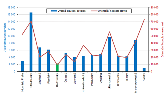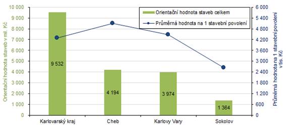 Tradičně nejvyšší průměrnou hodnotu na jedno stavební povolení vykázalo ve sledovaném období Hl. město Praha (17 610 tis. Kč), naopak nejnižší hodnotu tohoto ukazatele zaznamenal Jihočeský kraj, a to 2 965 tis. Kč. V Karlovarském kraji vzrostla meziročně průměrná hodnota na jedno stavební povolení o více než pětinu (o 28,9 %) na 4 282 tis. Kč a v mezikrajském srovnání se jedná o třetí nejnižší průměrnou hodnotu na jedno stavební povolení v rámci celé ČR. Na celorepublikový průměr nedosahuje karlovarský region o 1 678 tis. Kč.