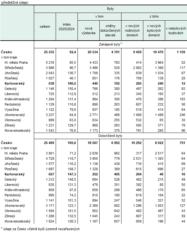 V Česku byla od ledna do září 2025 zahájena výstavba 25 235 bytů, což bylo o 7,6 % méně než ve stejném období předchozího roku. Počet zahájených bytů se zvýšil v sedmi krajích, v ostatních krajích došlo k poklesu zahájené bytové výstavby. Největší meziroční snížení zaznamenal Plzeňský kraj, kde došlo k propadu zhruba o 54 %.