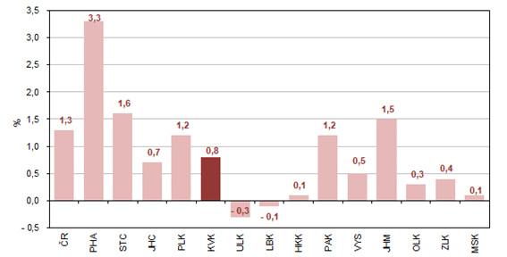 Z pohledu počtu zaměstnanců došlo ve 2. čtvrtletí 2022 k meziročnímu poklesu v krajích Ústeckém (o 0,3 %) a Libereckém (o 0,1 %). Na druhé straně výrazně vzrostl počet zaměstnanců v Hlavním městě Praze (o 3,3 %). V ostatních regionech rostly počty zaměstnanců do 1,6 %, v Karlovarském kraji činil tento nárůst 0,8 %.