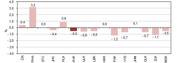 Z pohledu počtu zaměstnanců došlo ve 3. čtvrtletí 2023 ve většině krajů k meziročnímu poklesu. Nejvýraznější pokles byl zaznamenán v Pardubickém kraji (o 1,2 %). V našem kraji činil tento pokles 0,5 %, a to společně s krajem Moravskoslezským a Libereckým. Na druhé straně výrazně vzrostl počet zaměstnanců v Hlavním městě Praze (o 3,2 %), vyšší nárůst byl i v Plzeňském kraji (o 0,9 %).