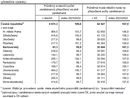 Ve 3. čtvrtletí 2023 v Karlovarském kraji vzrostla průměrná hrubá měsíční nominální mzda zaměstnanců oproti stejnému období předchozího roku o 6,6 %, reálně však zaznamenala pokles o 1,3 %. Průměrný evidenční počet zaměstnanců se meziročně mírně snížil.