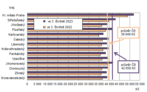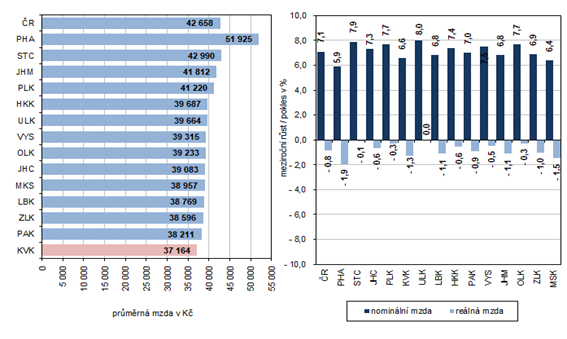 Průměrná hrubá měsíční mzda ve 3. čtvrtletí 2023 činila v našem kraji 37 164 Kč, což je o 6,6 % více než ve stejném období minulého roku. Karlovarský kraj zůstává nadále regionem s nejnižší mzdovou úrovní. V porovnání s výší průměrné hrubé měsíční mzdy v České republice (42 658 Kč) byla průměrná mzda v Karlovarském kraji nižší o 5 494 Kč, tj. o 12,9 %. Nejvyšší mzdu pobírali tradičně zaměstnanci v Hlavním městě Praze (51 925 Kč), tato průměrná mzda výrazně převyšuje i celorepublikovou hodnotu.