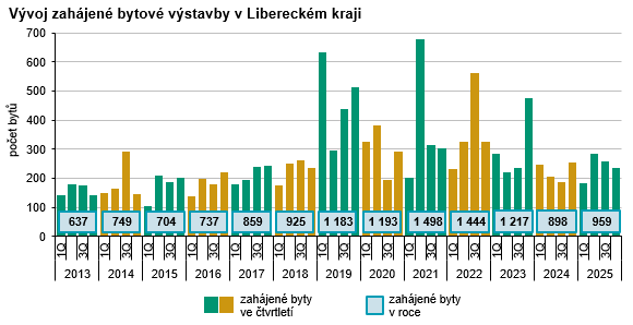 V průběhu roku 2025 byla v Libereckém kraji zahájena výstavba 959 bytů, tj. ve srovnání s rokem 2024 o 61 bytů a 6,8 % více. Meziroční propad byl vykázán v 1. čtvrtletí (-26,6 % a -66 bytů) a ve 4. čtvrtletí roku (-22 bytů a -8,6 %). Ve 2. a 3. čtvrtletí byl počet zahájených bytů meziročně vyšší, a to v prvním případě o 38,8 % (+80 bytů) a ve druhém o 36,7 % (+69 bytů).