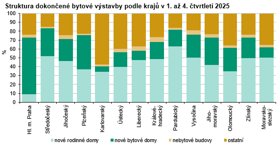 Nová výstavba mezi dokončenými byty převažuje ve všech krajích s výjimkou Karlovarského regionu. Podíl tohoto typu výstavby se tak pohybuje v intervalu od 40,5 % v Karlovarském do 83,9 % ve Středočeském kraji. Nejvyšší podíl bytů dokončených v nových rodinných domech zaznamenal Pardubický kraj (63,0 %), v hlavním městě Praze nepřekvapivě nejvýrazněji převažovaly byty dokončené v nových bytových domech (63,9 %). Nejvyšší zastoupení dokončených bytů v nebytových stavbách vykázal kraj Liberecký (5,4 %), následoval Královéhradecký kraj (5,3 %) a také Kraj Vysočina (5,1 %).