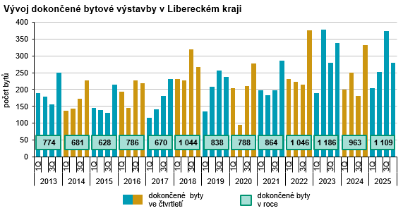 V průběhu 1. až 4. čtvrtletí 2025 bylo v Libereckém kraji dokončeno celkem 1 109 bytů, tj. v meziročním porovnání o 146 bytů a 15,2 % více. Meziročně více bytů bylo zkolaudováno v prvních třech čtvrtletích – v 1. a 2. čtvrtletí shodně +3 byty (tj. +1,5 %, resp. +1,2 %), ve 3. čtvrtletí +192 bytů (+106,1 %). Ve 4. čtvrtletí 2025 se počet dokončených bytů naopak snížil, a to o 15,7 % (-52 bytů). Z pohledu měsíčních statistik se meziročně nedařilo v prosinci (pokles o 55,1 %), únoru (-49,5 %), listopadu (-29,5 %) a květnu (-28,4 %). Naopak v porovnání s rokem 2024 byla dokončená bytová výstavba nejintenzivnější v září (+146,7 %), srpnu (+144,2 %) a říjnu (+121,7 %).