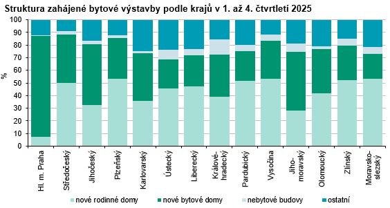 V Česku bylo během 1. až 4. čtvrtletí 2025 zahájeno celkem 35 819 bytů, tj. ve srovnání s loňským rokem o 2,2 % (795 bytů) méně. Vedle Libereckého kraje meziroční nárůst zahájené bytové výstavby evidovalo dalších 7 krajů. Absolutně nejvyšší přírůstek byl vykázán v Jihočeském kraji (+875 bytů, +46,8 %), nejvyšší relativní růst byl pak zjištěn v Karlovarském regionu (+56,6 %, +310 bytů). Meziročně nižší počet zahájených bytů vykázal kraj Plzeňský (-35,2 %), Moravskoslezský (-31,7 %), Kraj Vysočina (-20,8 %), Jihomoravský (-10,1 %), hlavní město Praha (-9,9 %) a Olomoucký (-0,5 %). Zahájená výstavba byla nejintenzivnější v hlavním městě Praze, ve kterém bude realizováno 7 380 bytů (20,6% podíl republikového úhrnu). Na druhé straně v Karlovarském kraji bylo zahájeno pouze 858 bytů (2,4% podíl). Liberecký kraj se na republikové zahájené výstavbě podílel 2,7 %, což je 2. nejnižší podíl. Převaha nové výstavby nad úpravami již dokončených staveb byla vykázána ve všech krajích, její podíl se pohyboval v rozmezí od 69,1 % v Ústeckém do 88,5 % ve Středočeském kraji. Hlavní město Praha vykázalo nejvyšší podíl nových bytů zahájených v bytových domech (80,0 %). Nejvyšší podíl bytů zahájených v nových rodinných domech vykázal Moravskoslezský kraj (53,5 %), který s nepatrným odstupem následoval Plzeňský kraj a Kraj Vysočina (shodně 53,2 %). Vyšší než 50% podíl evidoval ještě kraj Zlínský (52,3 %), Pardubický (51,8 %) a Středočeský (50,2 %). Nejvyšší podíl bytů zahájených v nebytových budovách zaznamenal Královéhradecký region (11,6 %), naopak nejnižší hlavní město Praha (0,7 %).
