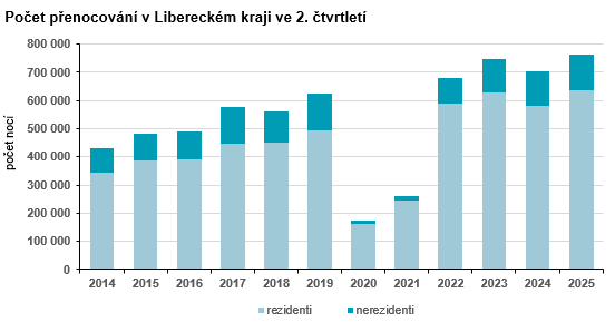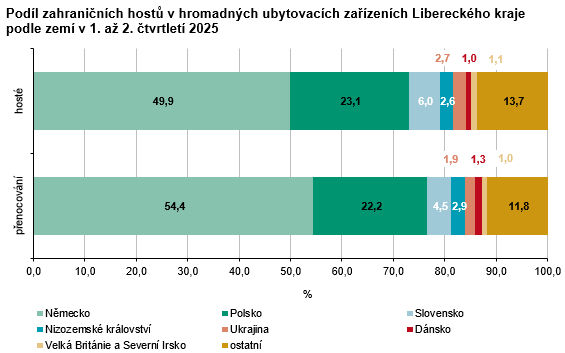 V úhrnu za 1. až 2. čtvrtletí roku 2025 do Libereckého kraje zavítalo 549 066 hostů, což je o 4,2 % více než ve stejném období 2024. Počet zahraničních hostů vzrostl o 8,3 % na 109 662 turistů. Zájem domácí klientely byl oproti stejnému období roku 2024 vyšší o 3,2 % a kraj tak navštívilo 439 404 hostů. Téměř polovinu zahraniční klientely tvořili hosté z Německa (49,9 %), 23,1 % hostů přicestovalo z Polska a 6,0 % připadlo na turisty ze Slovenska. Celkový počet přenocování se meziročně navýšil o 3,0 % na 1 516 116 nocí. Počet přenocování zahraničních hostů se zvýšil o 8,1 % na 300 029 nocí, u domácích hostů byl nárůst nižší a činil 1,8 % na 1 216 087 nocí. Průměrná doba přenocování v úhrnu a v případě domácích hostů trvala shodně 2,8 noci, doba pobytu tedy představovala 3,8 dne. U zahraničních hostů byla průměrná doba přenocování nepatrně nižší, tj. 2,7 noci a délka pobytu činila tedy 3,7 dne.