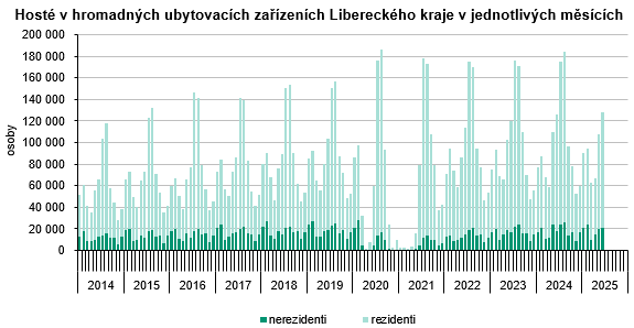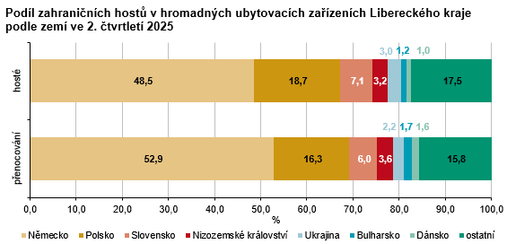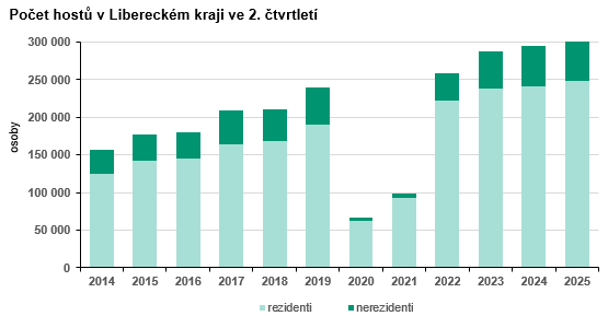 Ve 2. čtvrtletí roku 2025 se v hromadných ubytovacích zařízeních Libereckého kraje ubytovalo celkem 302 563 hostů, tedy o 8 082 hostů (2,7 %) více než ve stejném období roku 2024. Počet domácích turistů se zvýšil o 2,8 % na 247 839 hostů (tj. 81,9 % celkového počtu hostů v kraji), počet hostů z ciziny vzrostl o 2,3 % na 54 724 hostů. Necelou polovinu zahraničních hostů v tomto období představovali turisté z Německa (48,5 %), 18,7 % hostů přijelo z Polska a 7,1 % ze Slovenska.