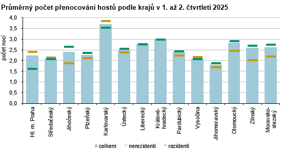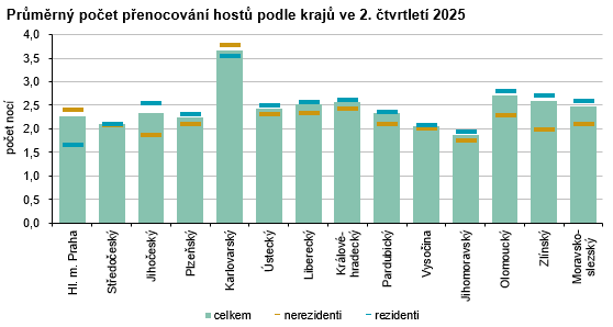 Celkový počet přenocování se meziročně zvýšil jak v Česku, tak ve všech krajích. Republikový přírůstek činil 6,9 %, přírůstek mezi kraji se pohyboval v intervalu od +3,0 % v Libereckém kraji do +12,9 % v Ústeckém kraji. Ve všech regionech se pozitivně vyvíjel také počet přenocování domácích turistů, v tomto případě byl nejvyšší přírůstek zjištěn v Pardubickém (+11,3 %) a nejnižší ve Středočeském kraji (+2,0 %). V případě hostů ze zahraničí došlo k meziročnímu zvýšení počtu strávených nocí ve 12 krajích, nejvýraznější růst vykázal Ústecký kraj (+19,6 %). V Moravskoslezském regionu a Kraji Vysočina se počet přenocování zahraničních návštěvníků naopak snížil (-8,1 %, resp. -4,9 %). Průměrný počet přenocování se pohyboval od 1,9 noci v Jihomoravském do 3,7 noci v Karlovarském kraji. V Karlovarském kraji vykázali nejdelší pobyt zahraniční i domácí návštěvníci (3,8 noci, resp. 3,5 noci), naopak nejkratší dobu zahraniční turisté nocovali v Jihomoravském kraji (1,8 noci), zatímco domácí návštěvníci v hlavním městě Praze (1,7 noci).