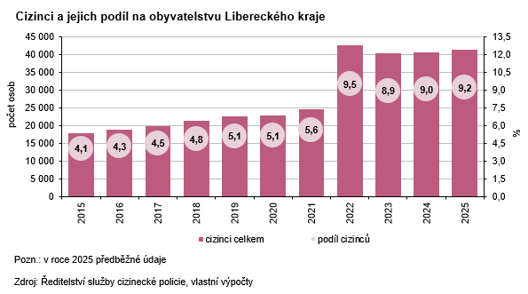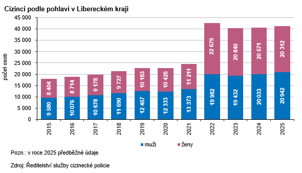 Podle předběžných údajů Ředitelství služby cizinecké policie pobývalo na konci roku 2025 na území Libereckého kraje 41 254 cizinců, tj. meziročně o 650 osob více (+1,6 %). Ve srovnání s předchozími třemi lety opět mírně převažovali muži (50,8 %, tj. 20 942 osob). Více než polovina cizinců pobývala v okrese Liberec (51,1 %, 21 092 osob), nejméně cizinců setrvávalo v okrese Semily (9,6 %, 3 959 osob). Na populaci našeho kraje se cizinci podíleli 9,2 % (meziročně +0,2 p. b.).
