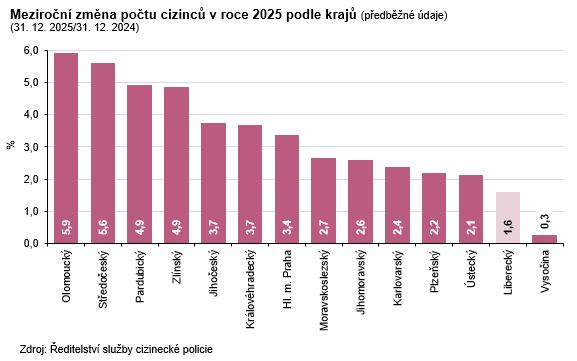 Počet cizinců se v Česku meziročně zvýšil o 3,4 % (+37 108 osob). Stejný vývoj byl zaznamenán také ve všech krajích. Nejvýraznější relativní přírůstek vykázal Olomoucký (+5,9 %), následoval Středočeský kraj (+5,6 %). Absolutně se pak počet cizinců navýšil nejvíce v hlavním městě Praze (+11 904 osob). Relativní i absolutní nárůst vykázaný v Libereckém kraji byl po Kraji Vysočina (+0,3 % a +83 osob) 2. nejnižší.