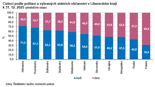 Ze zemí Evropské unie pocházelo 21,3 % cizinců, zbývajících 78,7 % připadalo na cizince z ostatních zemí. Nejpočetnější skupinou byly z hlediska státního občanství Ukrajinci, jejich podíl na celkovém počtu cizinců v kraji dosáhl 59,5 % (24 532 osob). Meziročně se jejich počet zvýšil o 649 osob (+2,7 %). Více než 54 % z nich žije na území okresu Liberec. Ve srovnání s rokem 2022, kdy se počet cizinců s ukrajinským státním občanstvím v souvislosti s válečným konfliktem na Ukrajině v našem regionu meziročně více než ztrojnásobil, je počet těchto cizinců evidovaný v roce 2025 o 5,9 % nižší.