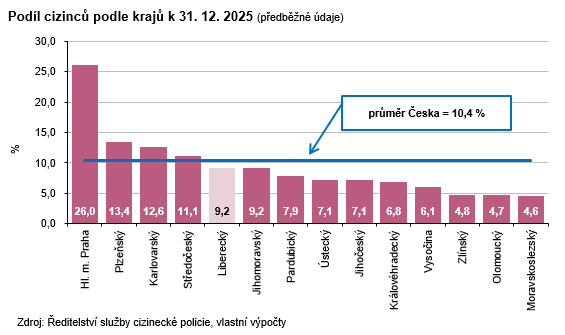 Na konci roku 2025 žilo v úhrnu na území Česka 1 131 197 cizinců, kteří tak tvořili 10,4 % celkového počtu obyvatel. Největší část z nich byla evidována na území hlavního města Prahy (32,4 % republikového počtu cizinců, tj. 366 227 osob a 26,0% podíl na populaci tohoto regionu), nejméně pak ve Zlínském kraji (27 432 osob, tj. 2,4 % na celkovém počtu cizinců v Česku a 4,8% podíl na populaci kraje). Počet cizinců v Libereckém kraji byl v mezikrajském srovnání 6. nejnižší a na celorepublikovém počtu cizinců se podílel 3,6 %. Podíl na celkovém počtu obyvatel Libereckého kraje představoval v mezikrajském srovnání 5. nejvyšší hodnotu. Nejmenší měrou se cizinci podíleli na populaci Moravskoslezského kraje (4,6 %).
