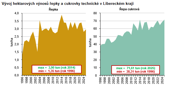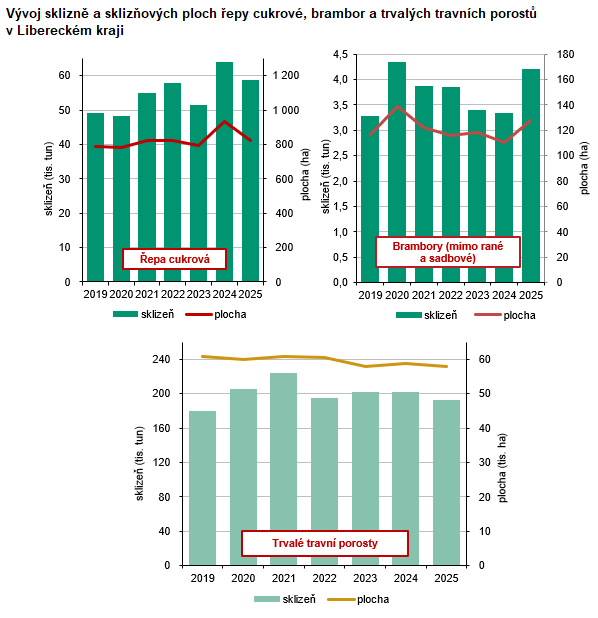 Příznivá byla v roce 2025 také produkce brambor – ze 128 ha sklizňové plochy (meziročně +16,1 %) bylo při výnosu 32,94 tun/ha (+8,7 %) získáno 4 209 tun plodiny (+26,2 %). Pozitivní vývoj ve všech parametrech zaznamenala ještě řepka, které bylo vyprodukovalo 15 763 tun, tedy o 6,4 % více než v roce 2024.