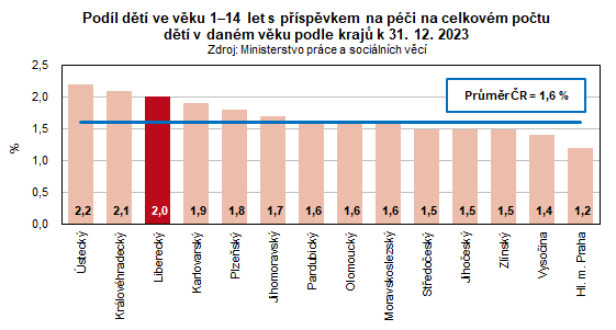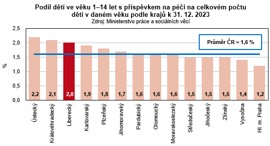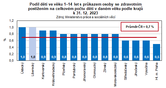 V Libereckém kraji bylo k 31. 12. 2023 celkem 1 347 dětí do 14 let (včetně), jejichž rodiče na ně kvůli jejich zdravotnímu stavu pobírali příspěvek na péči. Uvedená hodnota představuje 2,0 % všech dětí ve věku 1–14 let žijících v regionu, podíl byl vyšší u chlapců (2,5 %) než u dívek (1,4 %).