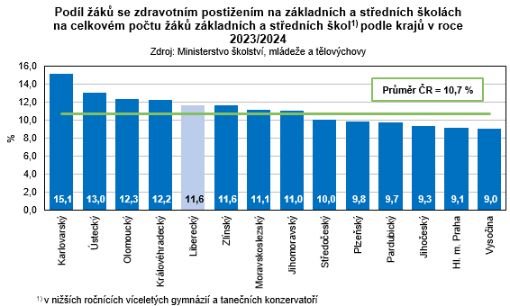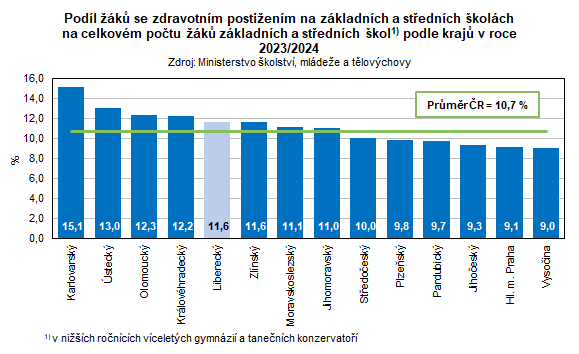 Napříč kraji Česka se pak podíl žáků do 14 let studujících na základních a středních školách a majících nějaké zdravotní postižení na celkovém počtu žáků těchto škol v daném věku pohyboval v rozmezí od 9,0 % v Kraji Vysočina do 15,1 % v Karlovarském kraji. Pod hodnotou podílu Česka, která činila 10,7 %, se pohyboval ještě údaj také v hlavním městě Praze (9,1 %) a dále kraji Jihočeském (9,3 %), Pardubickém (9,7 %), Plzeňském (9,8 %) a Středočeském (10,0 %). Hodnota našeho regionu byla naopak 5. nejvyšší.