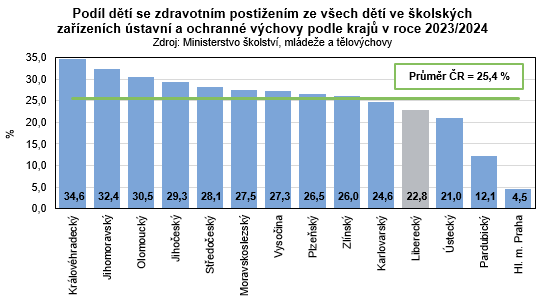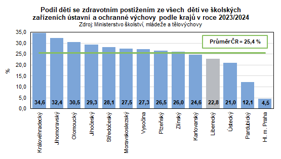 Ve školských zařízeních pro výkon ústavní a ochranné výchovy, kterými se rozumějí dětské domovy (včetně dětských domovů se školou), výchovné ústavy a diagnostické ústavy, bylo k 31. 10. 2023 v Libereckém kraji umístěno 61 dětí a mládeže se zdravotním postižením[4], tj. 22,8 % všech dětí a mládeže umístěných v těchto zařízeních. Podíl dětí se zdravotním postižením ze všech dětí umístěných ve školských zařízeních ústavní a ochranné výchovy se napříč kraji Česka nejčastěji pohyboval v rozmezí od 21,0 % v Ústeckém kraji do 34,6 % v Královéhradeckém kraji. Výrazně odlišný byl pak tento podíl pouze v hlavním městě Praze (4,5 %) a také v Pardubickém kraji (12,1 %).