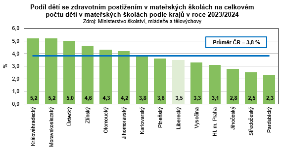 V jednotlivých krajích je v mateřských školách zastoupení dětí se zdravotním postižením různé. Jak již bylo zmíněno, tuto skutečnost ovlivňuje více faktorů, mezi něž se řadí rozdíly v dostupnosti zdravotní péče, socioekonomické odlišnosti, i různá praxe školských poradenských zařízení, která spolupracují se školami na nastavení vhodných individuálních podpůrných opatření ve vzdělávání. Vzhledem k tomu, že vzdělávání v mateřské škole není, až na poslední předškolní rok, povinné, může roli hrát i různá dostupnost a naplněnost kapacity mateřských škol v jednotlivých krajích. Někteří rodiče se tak mohou rozhodnout odložit nástup svého dítěte se zdravotními problémy do mateřské školy do pozdějšího věku. Nejvyšší podíl dětí s nějakým zdravotním hendikepem v rámci mateřských škol tak bylo vykázáno v Královéhradeckém a Moravskoslezském kraji (shodně 5,2 % s celkového počtu dětí v místních mateřských školách), naopak nejnižší hodnota byla zjištěna v Pardubickém regionu (2,3 %). Liberecký kraj se v tomto srovnání umístil na 6. nejnižší příčce. Z hlediska struktury závažnosti postižení bylo nejvíce děti se závažným postižením zaznamenáno opět v Královéhradeckém kraji (64,1% podíl na celkovém počtu zdravotně hendikepovaných dětí v místních mateřských školách), středně závažné postižení bylo nejvíce zastoupeno mezi dětmi v Moravskoslezském kraji (68,2 %) a nejvyšší podíl dětí s mírným postižením evidoval Kraj Vysočina (11,3 %).