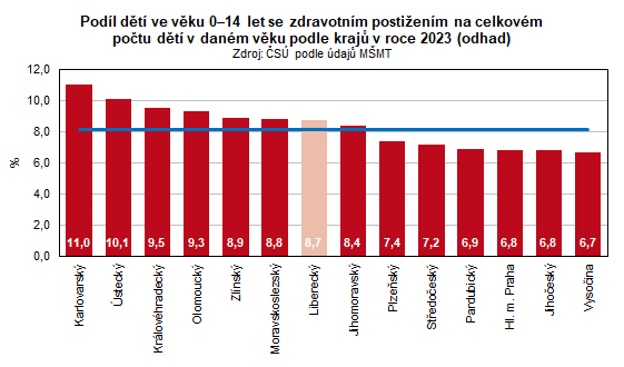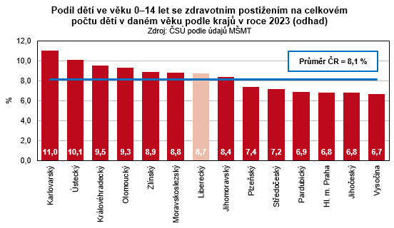 Odhadovaný celkový počet dětí se zdravotním postižením ve věku 0–14 let v Libereckém kraji ke konci roku 2023 činil 6,2 tis. dětí (tj. 4,4 % z republikového počtu 139,8 tis. zdravotně postižených dětí), z toho z více než 87 % se jednalo o chlapce. Podíl dětí se zdravotním postižením tak v celé krajské dětské populaci dosáhl 8,7 %, chlapci se přitom s určitým zdravotním hendikepem potýkali častěji (11,1 % všech chlapců ve věku 0–14 let) než dívky (6,0 %).
