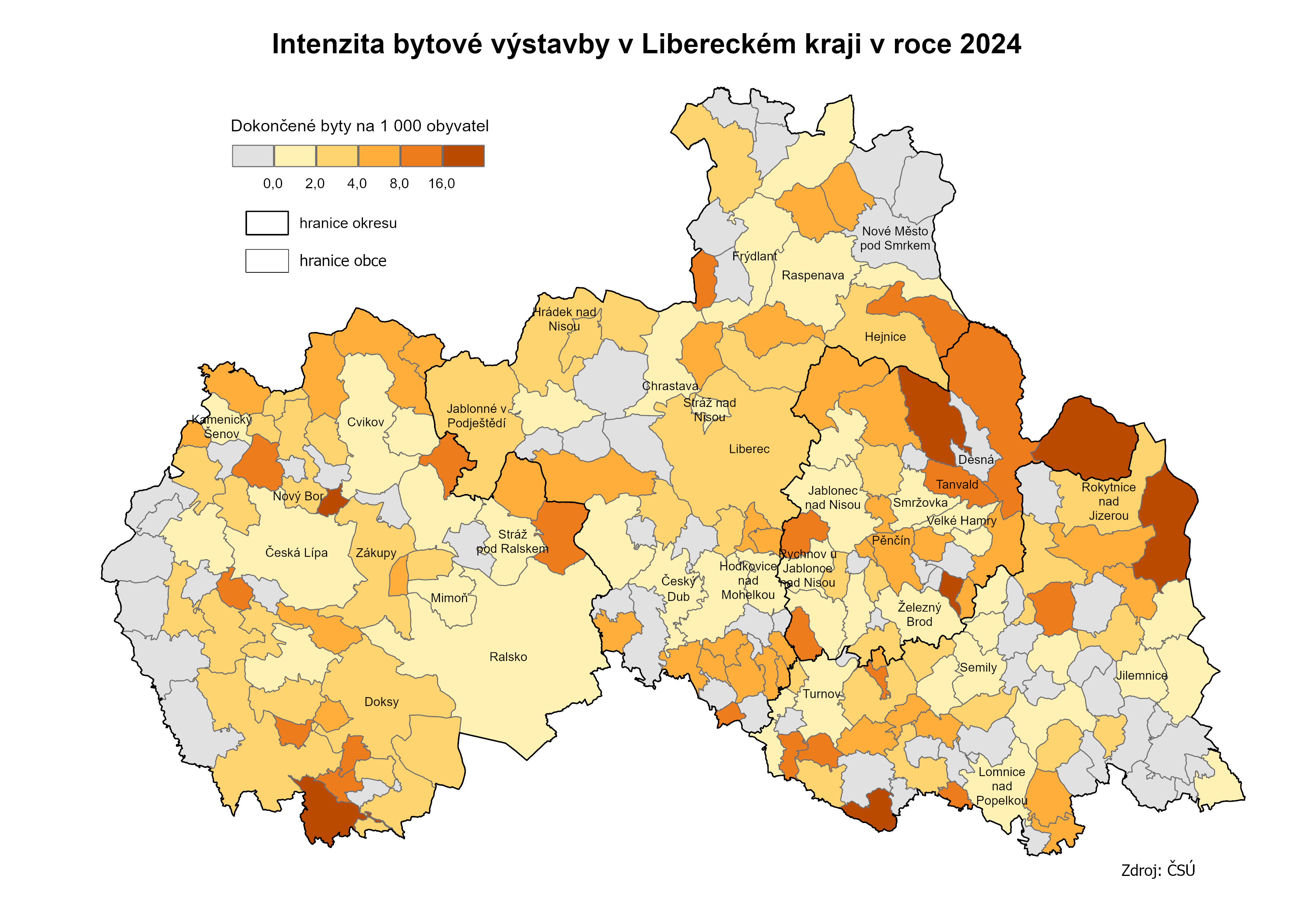 Ve městě Liberci bylo v roce 2024 dokončeno 219 bytů, což představovalo 22,7 % všech bytů dokončených v tomto roce v celém Libereckém kraji. Druhou příčku s 52 dokončenými byty obsadilo město Tanvald a třetí město Harrachov s 51 dokončenými byty. Deset a více dokončených bytů vykázalo v našem regionu 14 měst a obcí, alespoň 1 byt byl dokončen ve 150 městech a obcích. Zbývajících 65 měst a obcí vykázalo v loňském roce nulovou bytovou výstavbu. Z tohoto počtu připadlo 44,6 % na obce s 200 až 499 obyvateli, po 21,5 % tvořily obce do 199 obyvatel a také obce s 500–999 obyvateli, 9,2 % představovaly obce s 1 000 až 1 999 obyvateli a zbývajících 3,1 % připadlo na obce s 2 000 až 4 999 obyvateli. Nejvíce obcí, ve kterých nebyl dokončen ani 1 byt, evidoval okres Semily (24 obcí), následoval okres Liberec (21 obcí) a Česká Lípa (13 obcí). Nejméně jich pak bylo zaznamenáno na Jablonecku (7 obcí). Největší obcí bez dokončených bytů bylo město Nové Město pod Smrkem, naopak nejmenší byla obec Janovice v Podještědí.