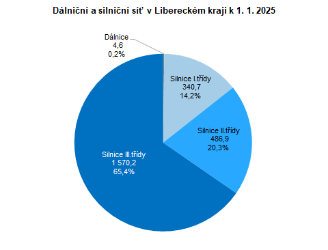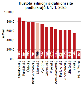 Síť silnic a dálnic v České republice k 1. 1. 2025 pokrývala 55 953 km. Největší měrou se na této rozloze dlouhodobě podílejí silnice III. třídy (ke sledovanému datu 34 014 km, tj. 60,8 % celkové délky silnic a dálnic). Dalších více než 26 % představovaly silnice II. třídy (14 726 km). Silnice I. třídy byly zastoupeny 10,2 % a dálnice tvořily 2,7 % republikové komunikační sítě. Meziročně se snížila rozloha silnic III. a I. třídy (-15,7 km, resp. -19,8 km), a to ve prospěch silnic II. třídy (+26,3 km) a dálnic (+97,7 km). Síť dálnic se pak nejvýrazněji rozšířila v Jihočeském (+43,6 km), Zlínském (+25,5 km) a Středočeském kraji (+23,1 km), o 5,2 km se rozšířily dálnice ještě také v Jihomoravském kraji a o 0,4 km v Olomouckém regionu.