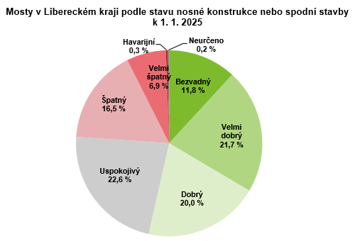 Podle stavu nosné konstrukce nebo spodní stavby (bere se v úvahu horší stav) se u mostů eviduje 7 stupňová škála – od bezvadného, přes velmi dobrý, dobrý, uspokojivý, špatný, velmi špatný až po havarijní stav. Do kategorie uspokojivý bylo s ohledem na jejich stav k 1. 1. 2025 zařazeno 204 mostů (22,6 %), u 196 mostů (21,7 %) byl konstatován velmi dobrý stav. Za bezvadné bylo označeno 107 mostů (11,8 %), naopak v havarijním stavu byly 3 tyto stavby (0,3 %). Nejvíce mostů ve velmi špatném až havarijním stavu se nacházelo v okrese Česká Lípa (22 staveb, resp. 1 stavba). V porovnání se situací k 1. 1. 2024 na jedné straně výrazně ubylo mostů v bezvadném stavu (-23 staveb), zároveň se však snížil počet mostů ve velmi špatném (-13 staveb) a havarijním stavu (-2 stavby). Více mostů bylo také ve velmi dobrém (+14 staveb), dobrém stavu (+5 staveb) a uspokojivém stavu (+15 mostů), na druhé straně se o 6 navýšil počet mostů ve špatném stavu. Alespoň uspokojivý stav nosné konstrukce tak začátkem roku 2025 mělo 76,1 % mostů (688 staveb), začátkem roku 2024 to bylo 75,1 % (677 staveb).