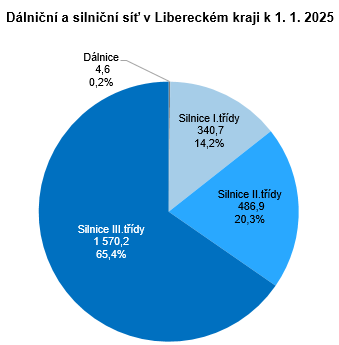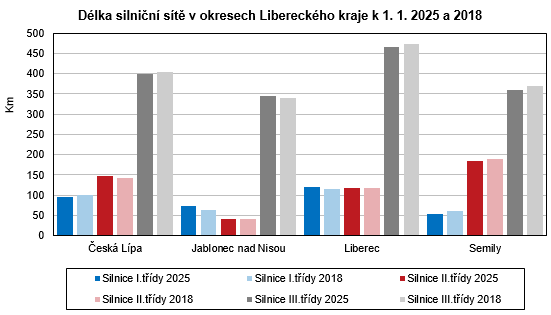 V Libereckém kraji bylo k uvedenému datu evidováno 2 402 km silnic a dálnic (4,3 % republikového úhrnu), meziročně o 1,4 km (0,1 %) méně. Také v případě našeho regionu výrazně převažovaly silnice III. třídy (1 570 km, tj. 65,4 %), následovaly silnice II. (20,3 %) a I. třídy (14,2 %). Jediný úsek dálnice v délce 4,6 km (0,2 %) na území našeho kraje vede od Turnova na hranici kraje směrem na Prahu a nachází se v okresech Semily (0,5 km) a Liberec (4,1 km). Meziročně se snížila výměra pouze u silnic I. třídy (-3,7 km, tj. -1,1 %), naopak přibylo silnic II. a III. třídy (+1,4 km v prvním a +0,9 km ve druhém případě). Výměra dálnic se nezměnila.